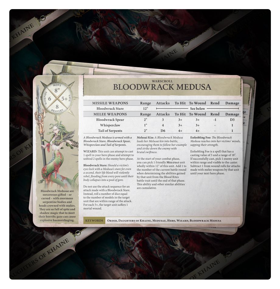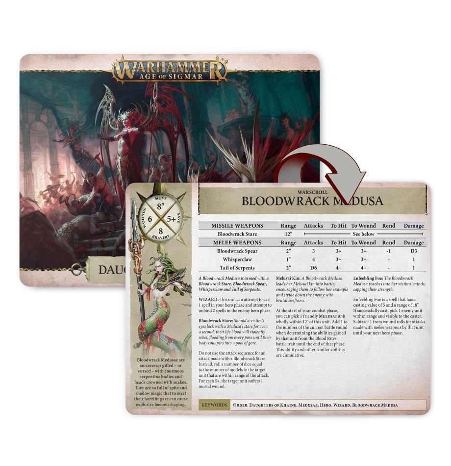 - 24x warscroll cards, one for each Daughters of Khaine unit and Endless Spell