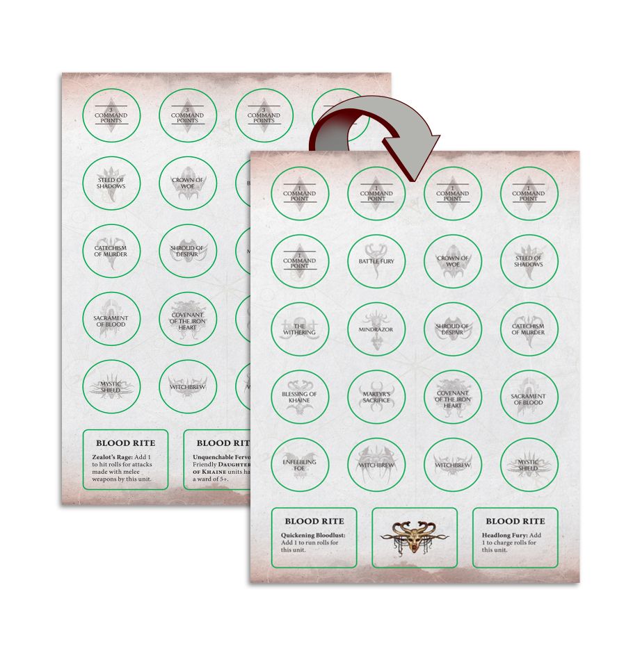 - 2x double-sided token sheets tailored to the spells, abilities, and tactics of the Daughters of Khaine