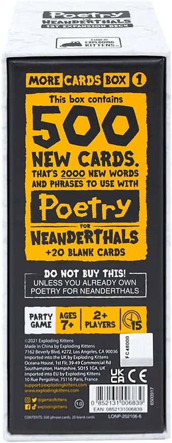 Introducing the 1st Expansion Pack for Poetry for Neanderthals - More Cards Box 1! Combine these 500 new cards with your original Poetry for Neanderthals game to play even more
